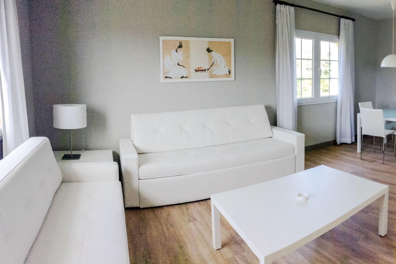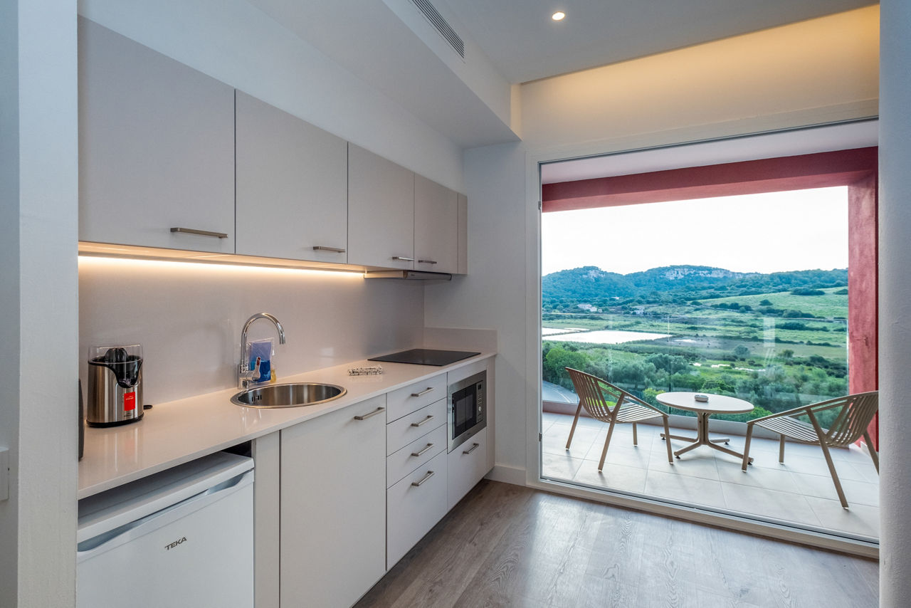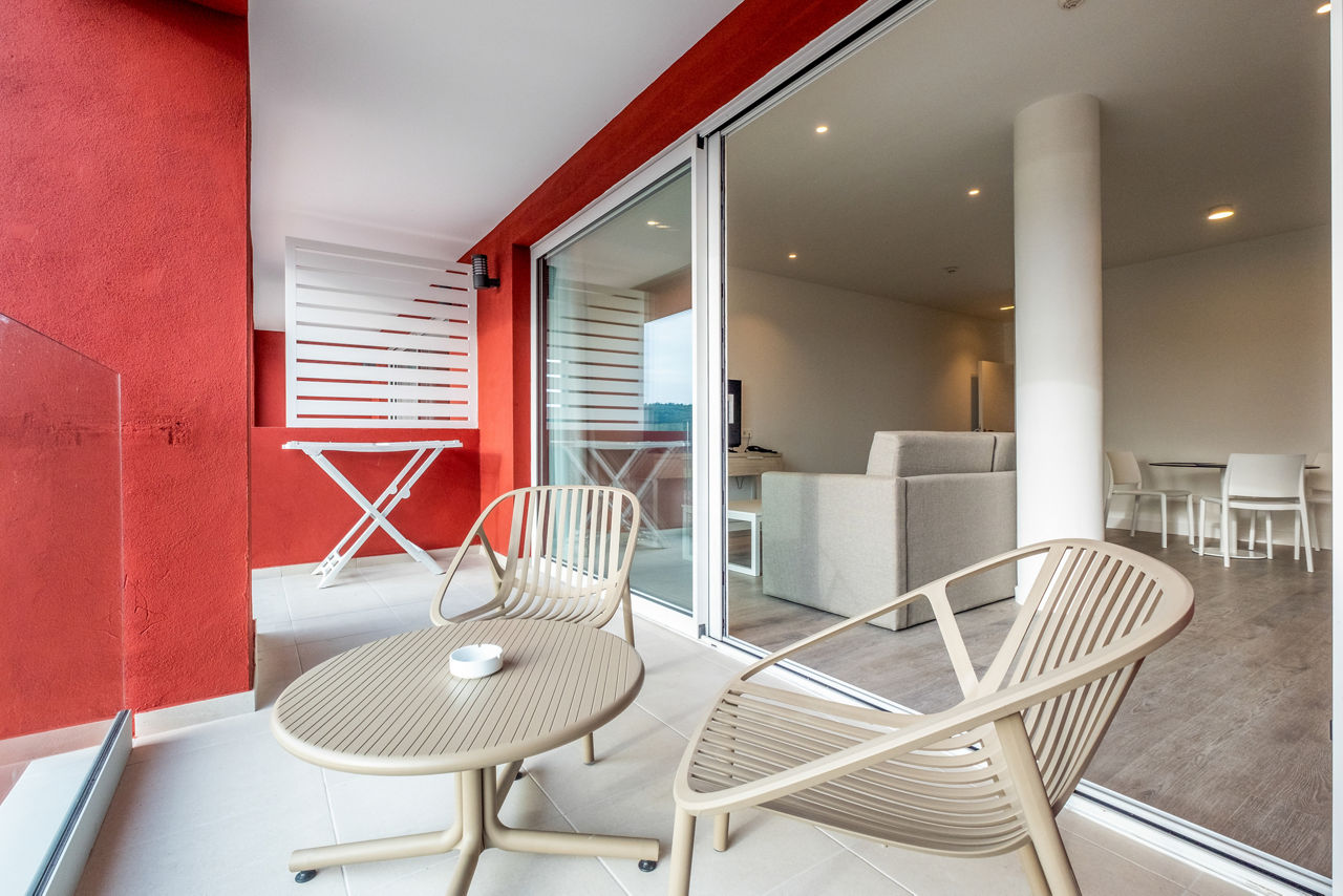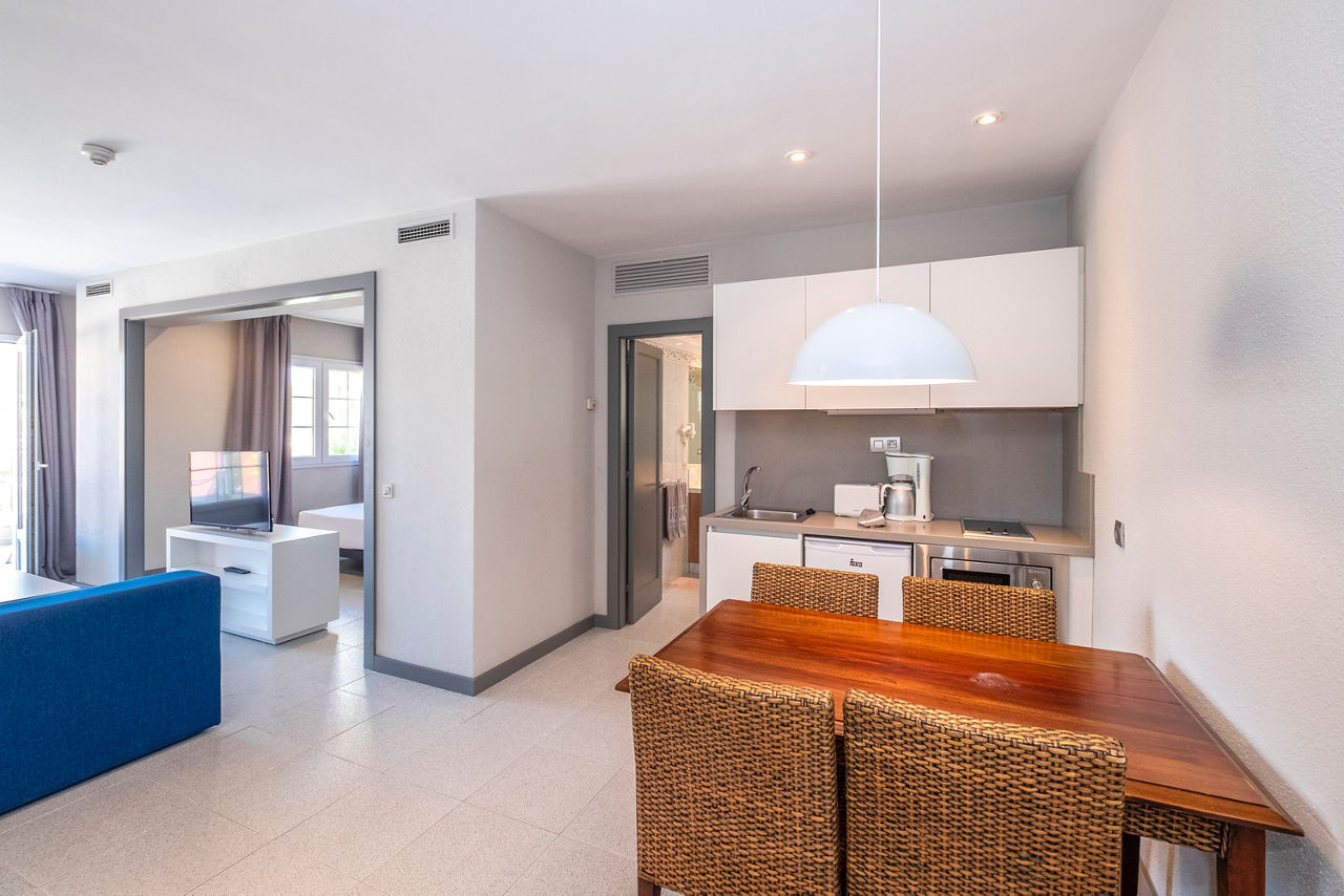 Junior suites sleep up to 3 adults or 2 adults and 2 children and have bathroom, air conditioning, hairdryer, television, double cooking rings, fridge, kettle, toaster and balcony or terrace.