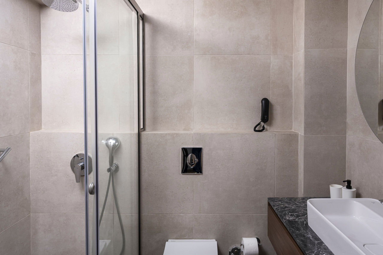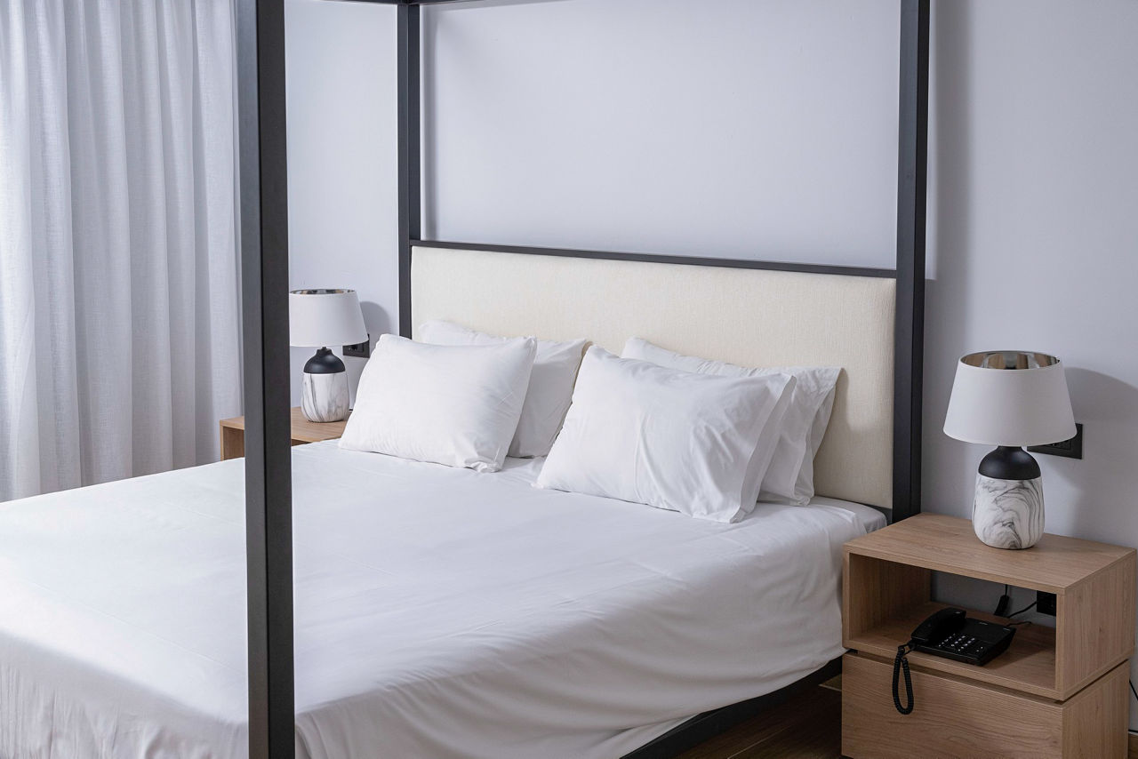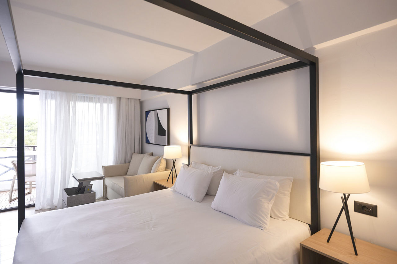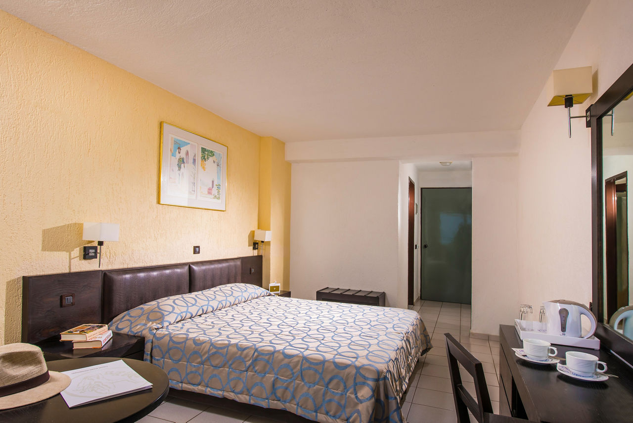 Standard Double rooms sleep up to 3 adults and have bathroom containing a bath or shower, air conditioning, hairdryer, flat screen television, safety deposit box*, fridge, kettle and balcony. Double rooms with Side Sea View and Single rooms are also available.