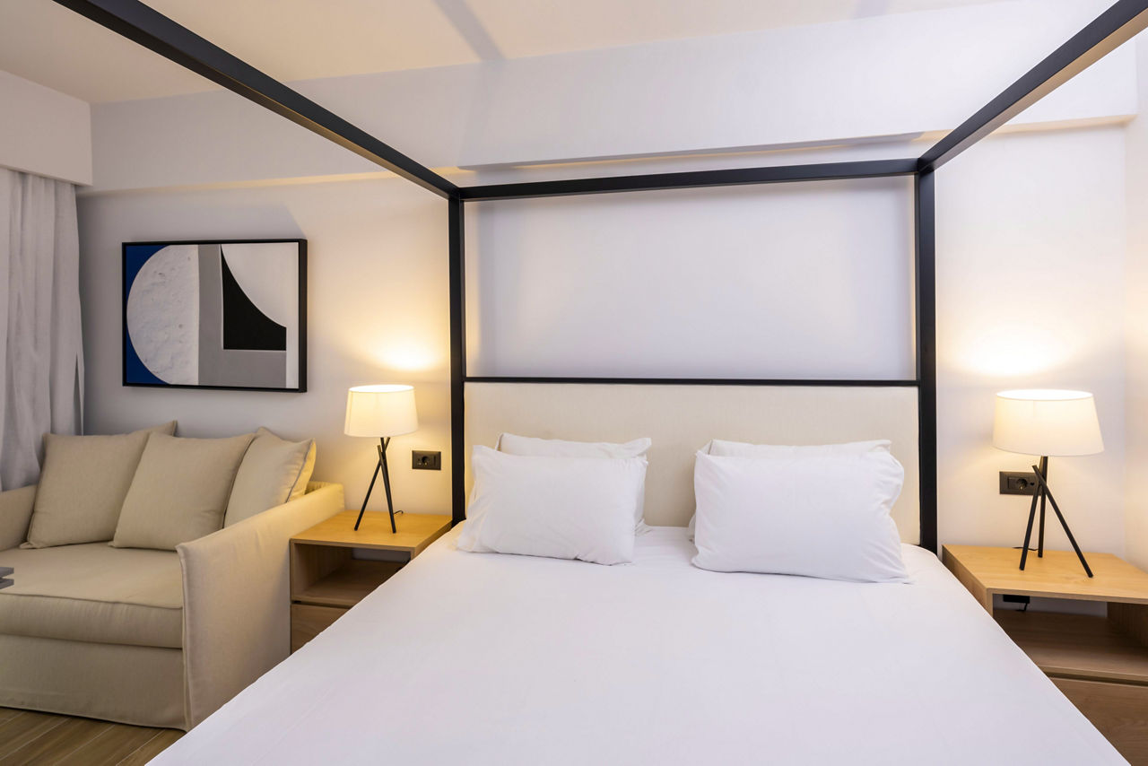 The All Inclusive Hersonissos Palace is situated in a great location close to Hersonissos resort centre. The fresh interiors of the hotel create a sense of relaxation, which makes the hotel a perfect place to unwind. Spend the day by the hotel's pool area enjoying the glorious sunshine, while refreshing with a drink from the bar.Standard Double rooms sleep up to 3 adults and have bathroom containing a bath or shower, air conditioning, hairdryer, flat screen television, safety deposit box*, fridge, kettle and balcony. Double rooms with Side Sea View and Single rooms are also available.