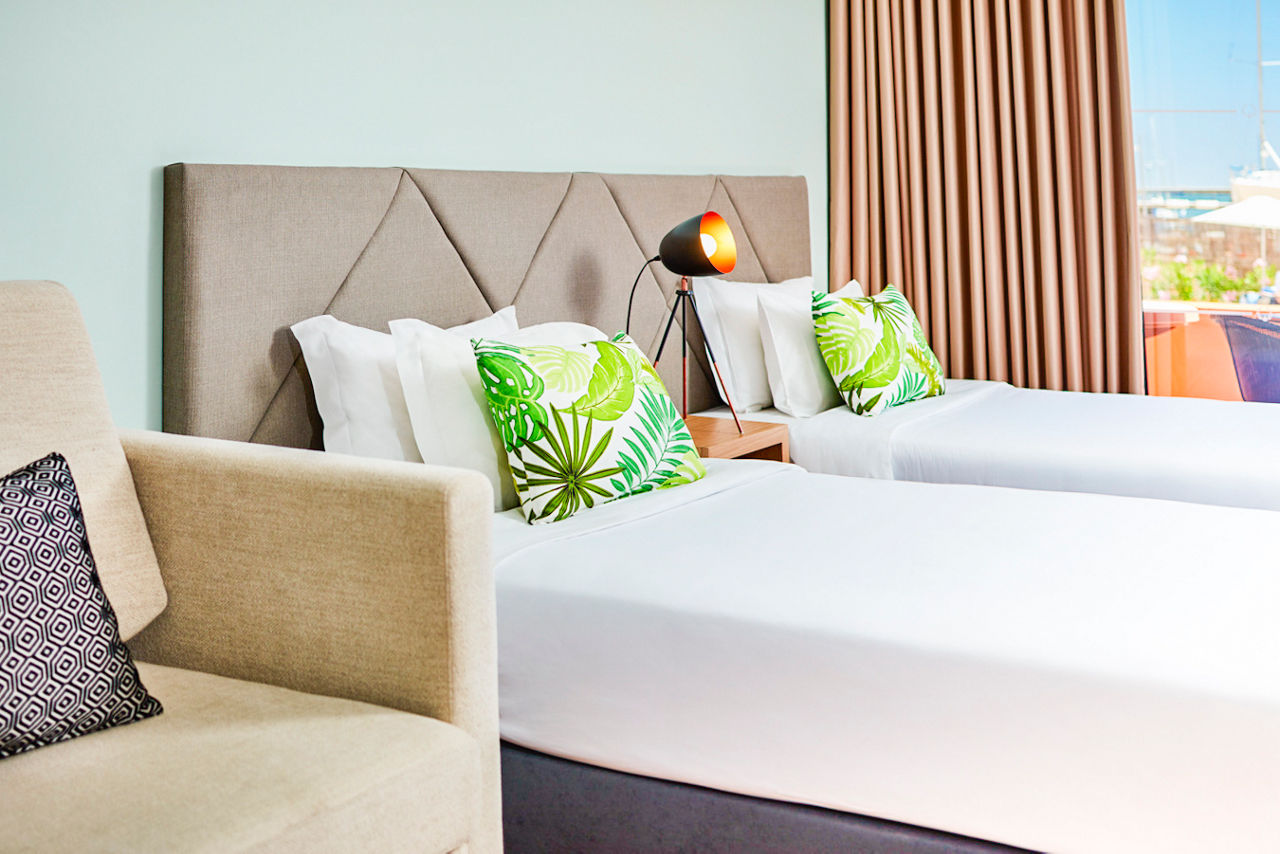 Marina Sun Twin rooms sleep up to 4 adults and have bathroom containing a bath with shower attachment, air conditioning, hairdryer, television, microwave, tea and coffee making facilities and balcony or terrace. Marina Deck Twin rooms, Sole Use rooms, Marina Beach Twin rooms and Marina Deck Deluxe Twin rooms, which are larger in size, are also available.