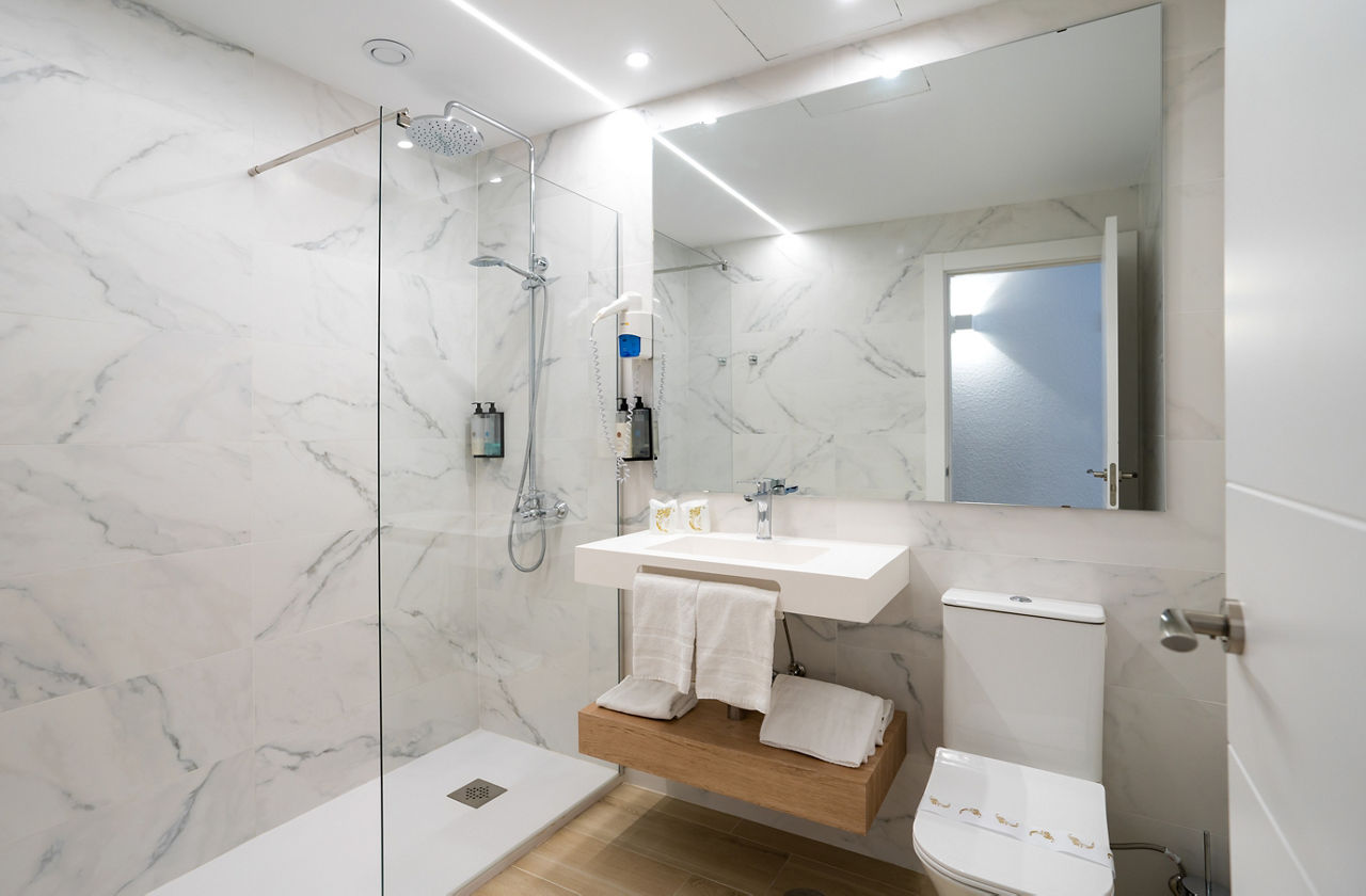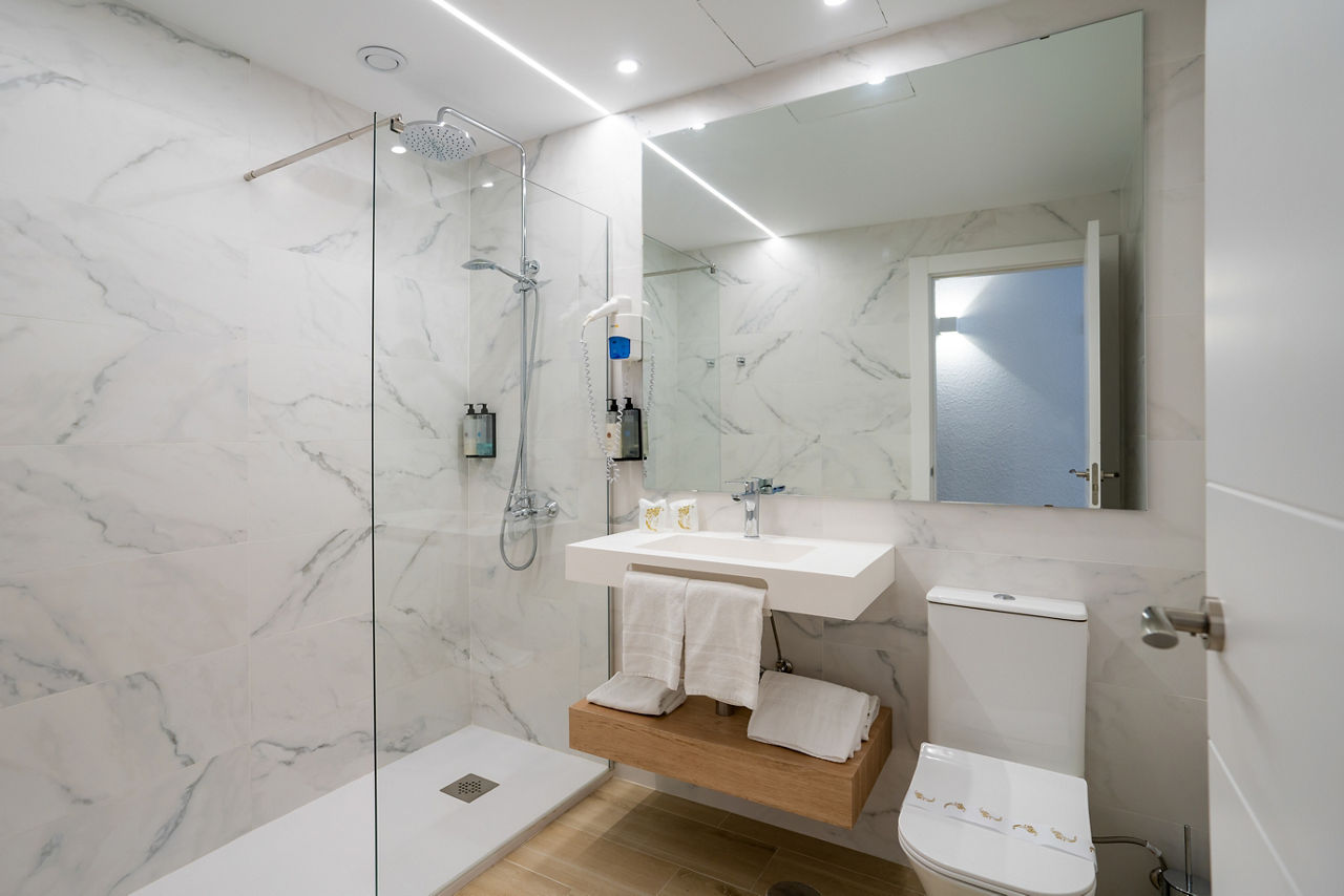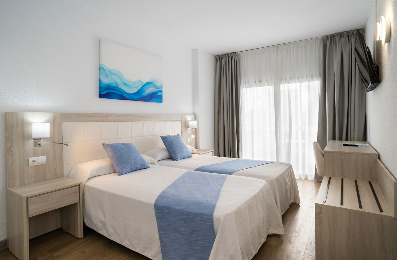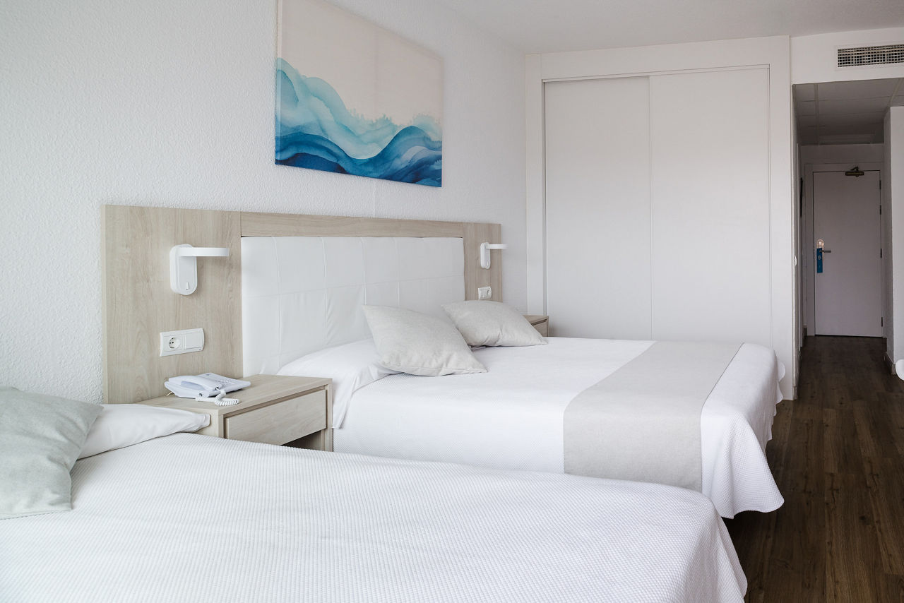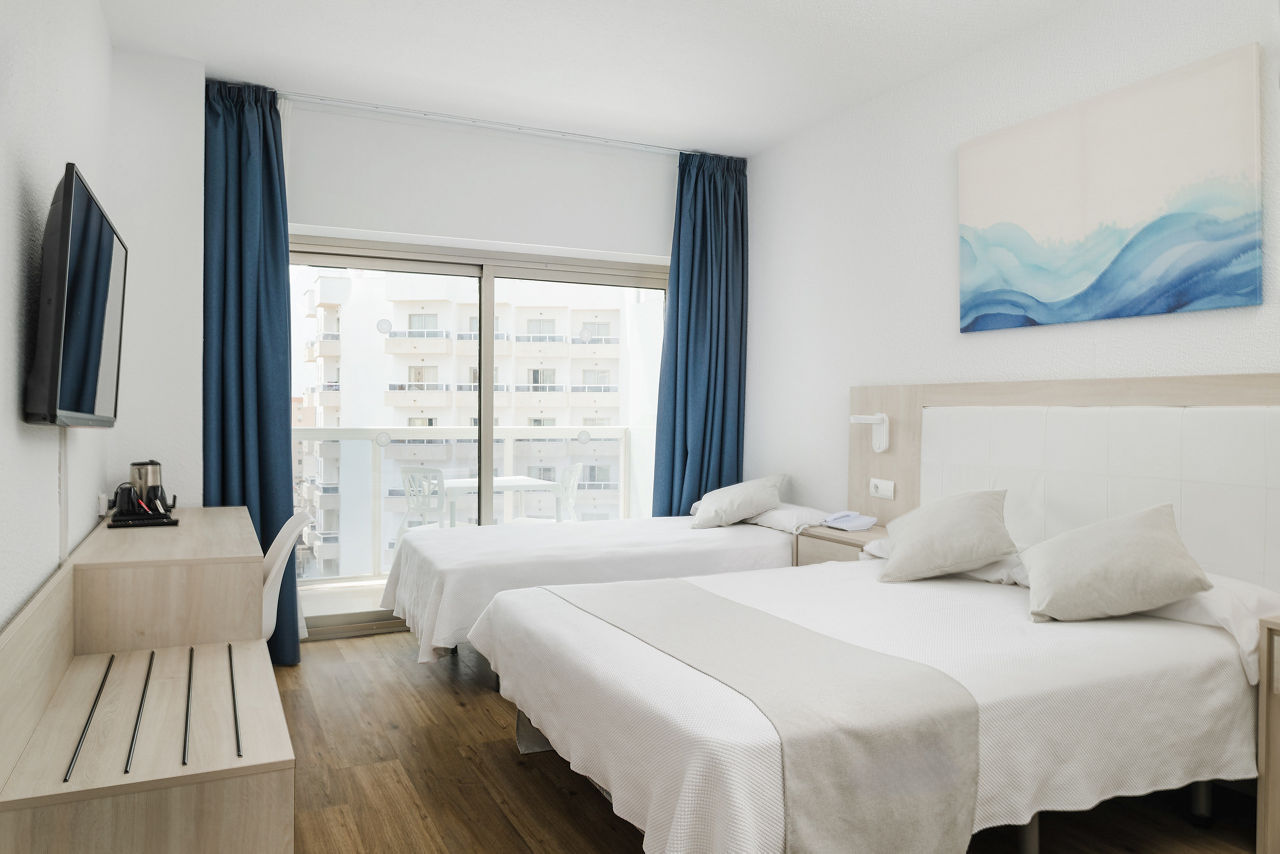 Twin rooms sleep up to 2 adults and have full bathroom, hairdryer, flat screen TV, safety deposit box*, air conditioning/central heating, free Wi-Fi and a balcony or terrace. Family rooms sleep up to 3 adults and 2 children, Twin rooms with Pool View and Twin rooms for Sole Use are also available at a supplement.