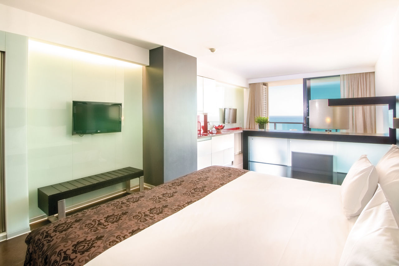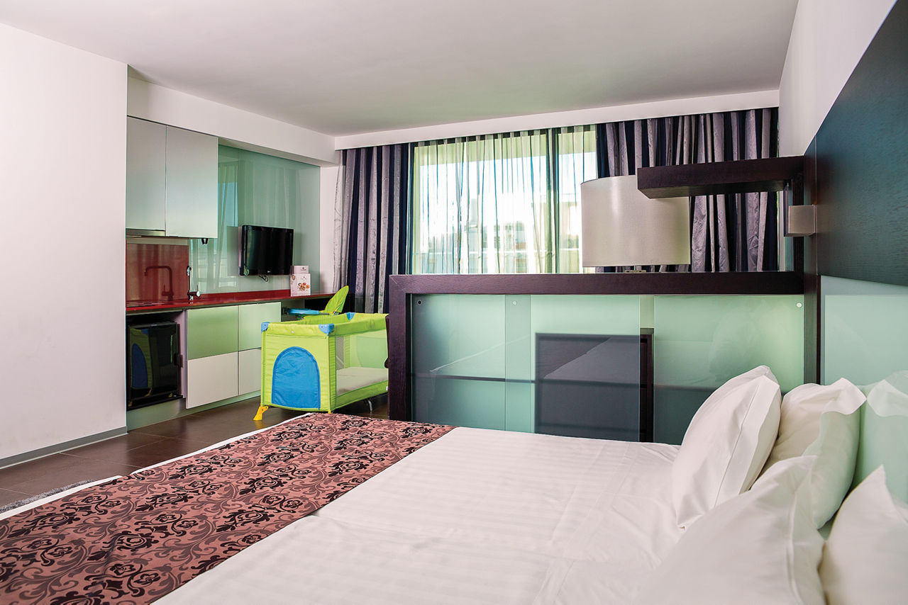 Classic suites sleep up to 3 adults and 1 child or 2 adults and 2 children and have a full bathroom, hairdryer, air conditioning, satellite TV,microwave, safety deposit box* and a balcony. Prestige suites with Side Sea View, Premium suites with Sea View, Deluxe suites with Sea View and Classic Family suites with City View are also available. Please note the Deluxe suites with Sea View are located on the upper floors.