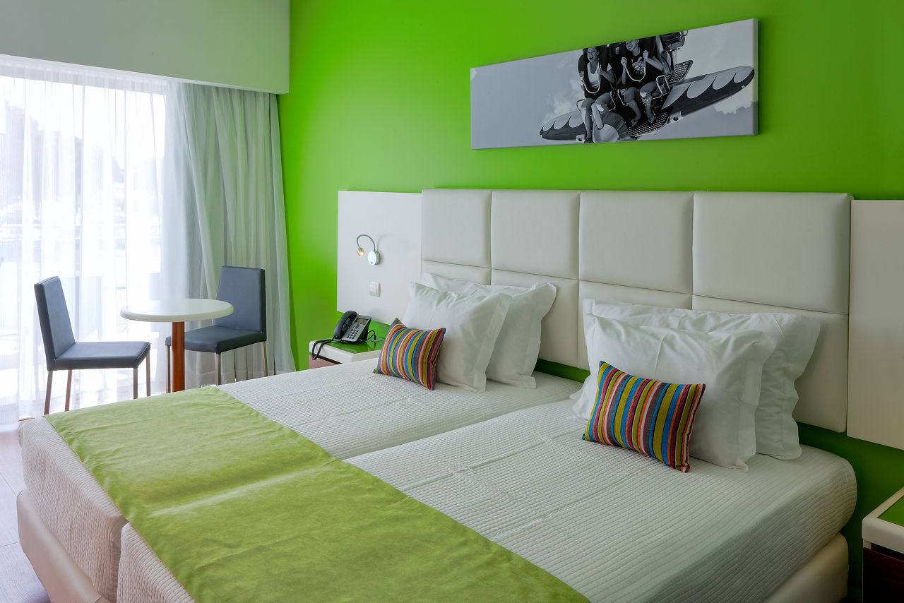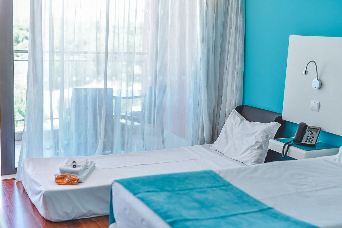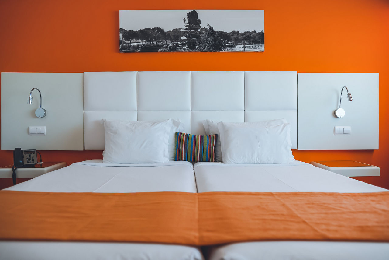 Double and Twin rooms sleep 2 adults and 1 child with individual beds and have a bathroom with walk-in shower, make-up mirror, hairdryer, air conditioning, satellite TV and a balcony. Single Parent rooms are also available. Baby cot free (on request). All rooms have a pool or park view.