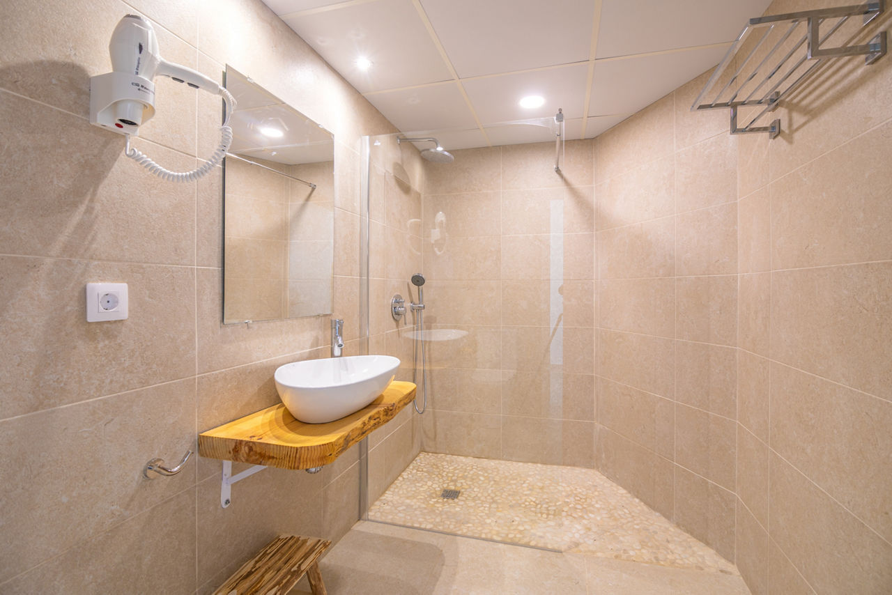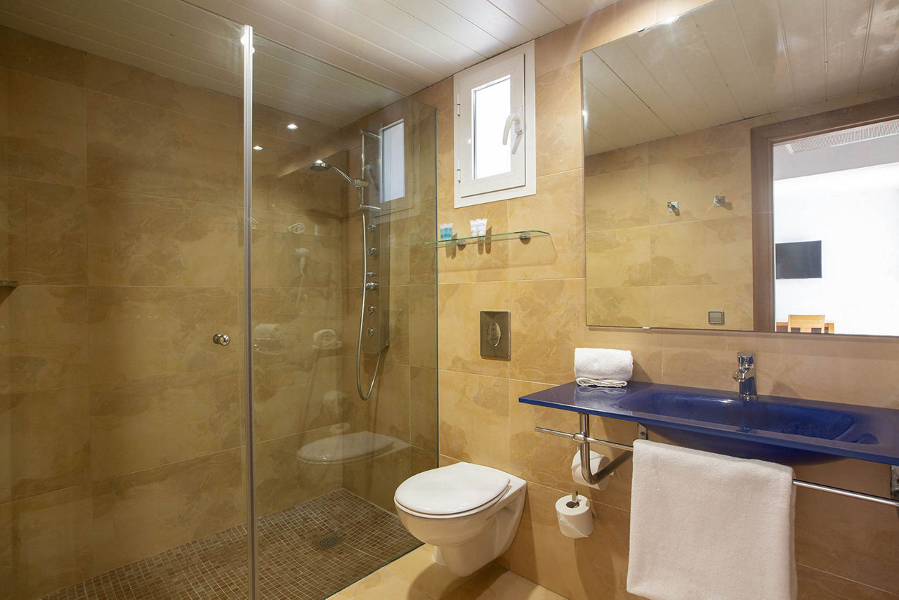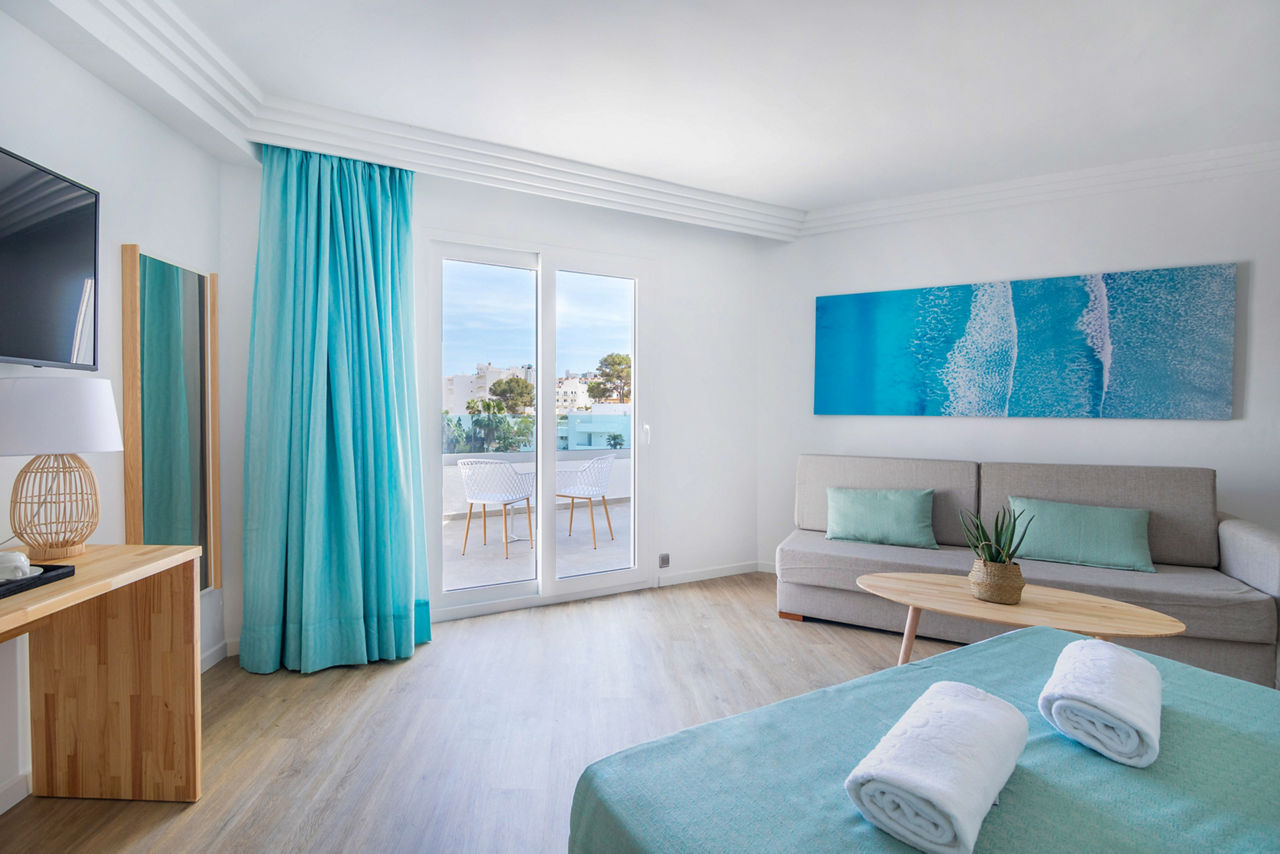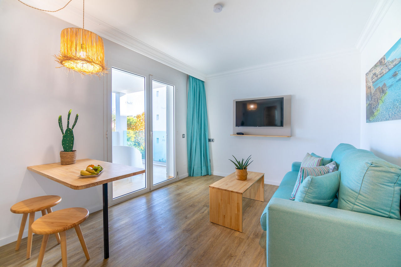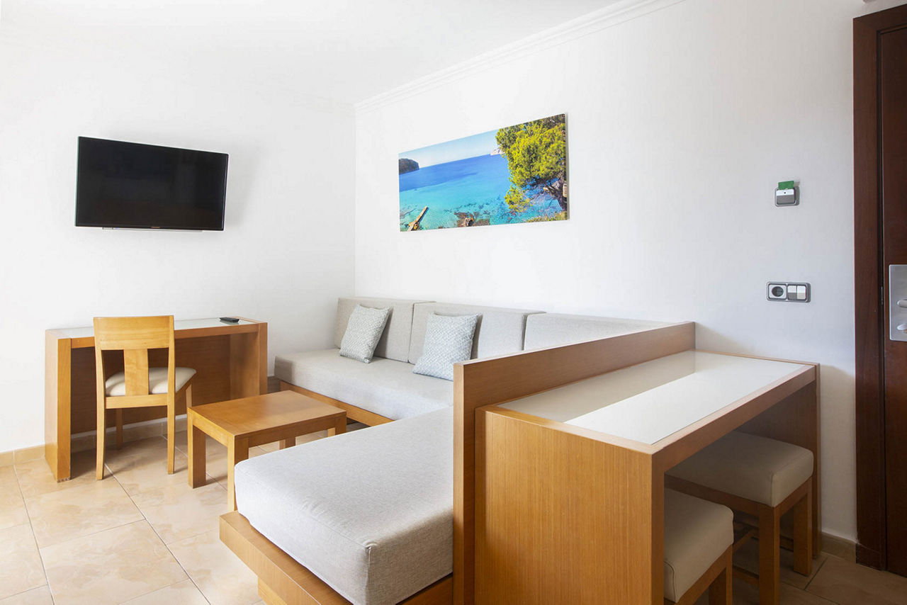 Double rooms sleep up to 3 adults and have bathroom with shower, air conditioning, flat screen satellite television and balcony or terrace. Apartments have one bedroom and a separate living room with kitchenette. Suites have one bedroom and a separate living room.